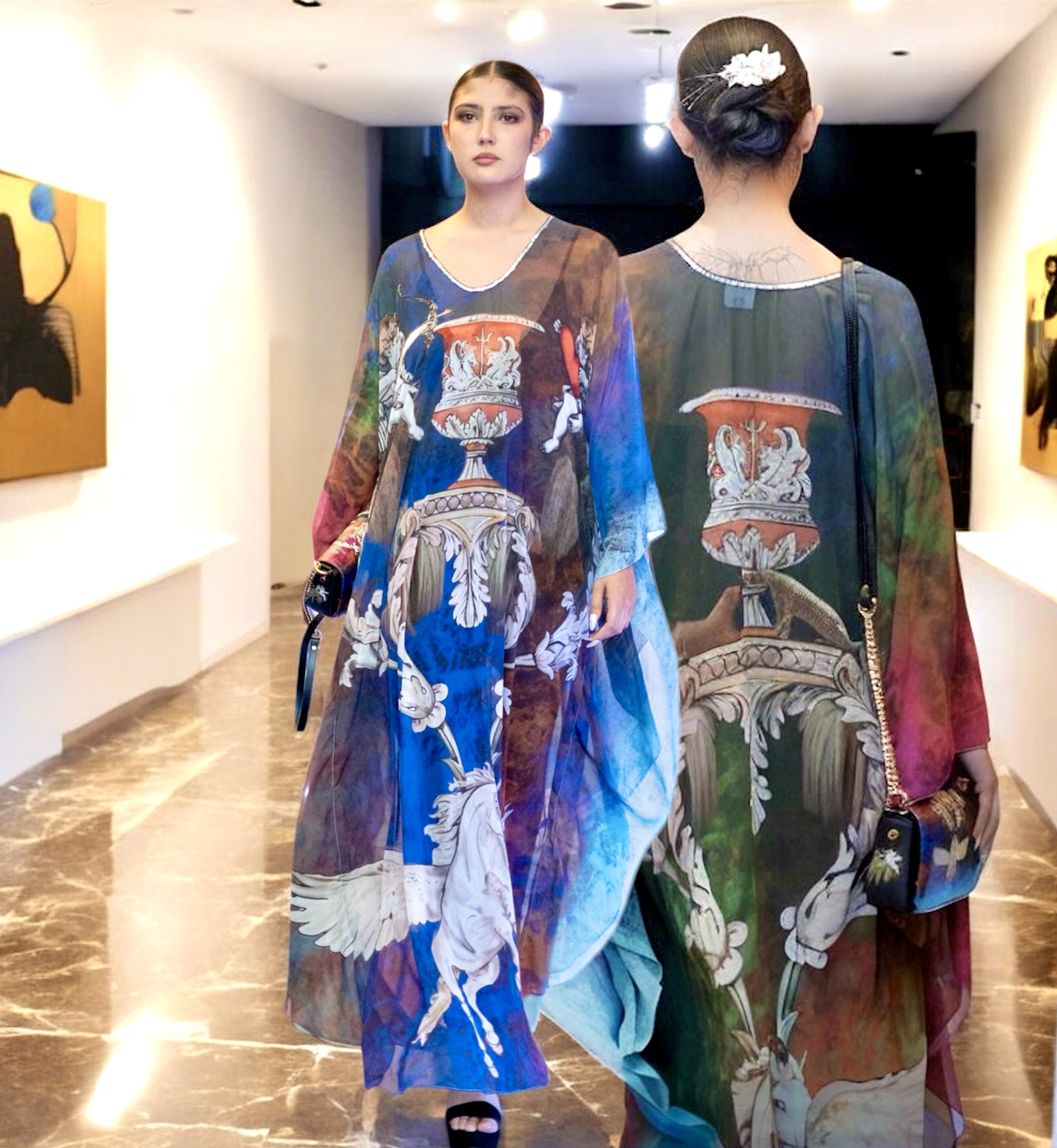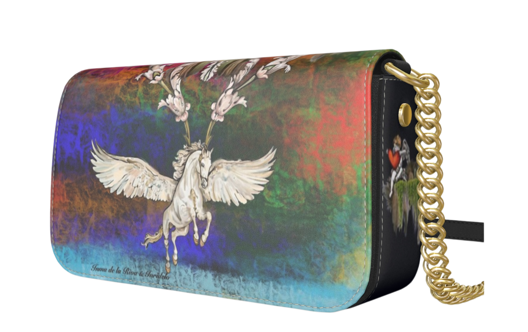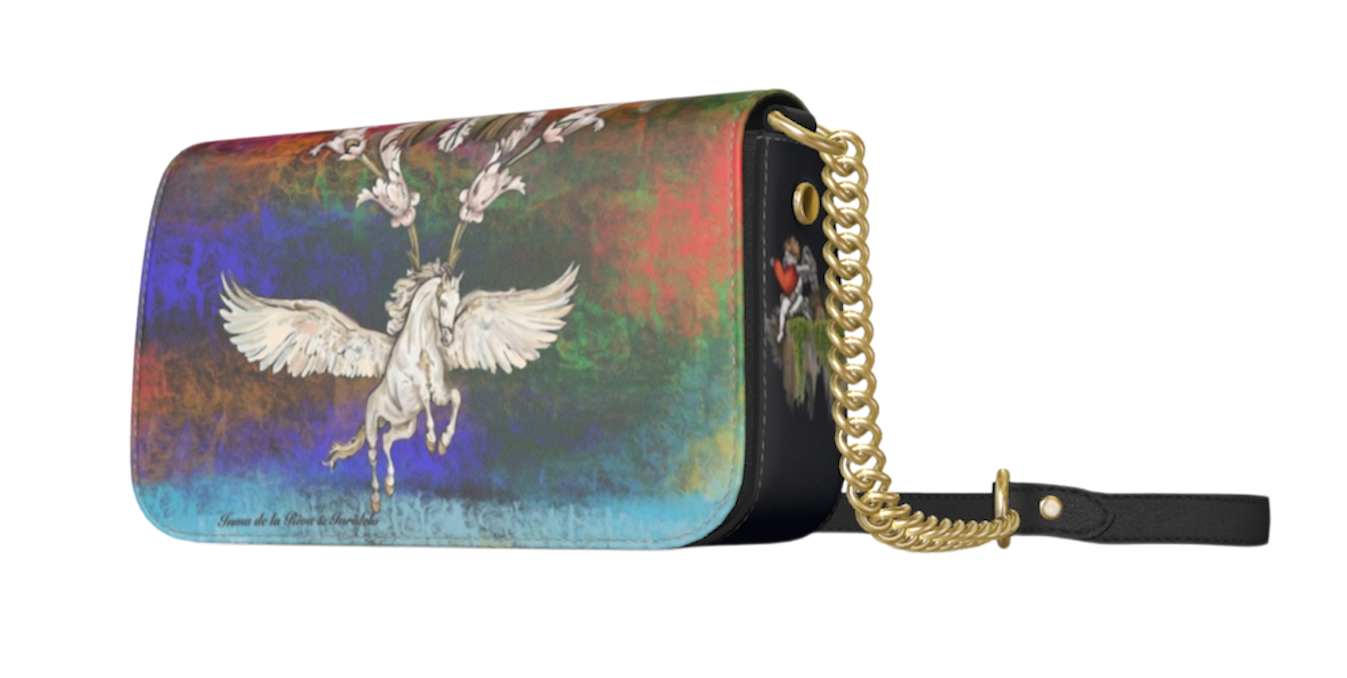 El bolso “Pegaso Celestial”, una creación de alta costura de la diseñadora Inma de la Riva, representa la fusión entre el arte y la moda, dando lugar a una pieza única e incomparable. El diseño, impreso sobre piel nappa auténtica, evoca la imagen del mítico caballo alado, símbolo de libertad, elegancia y poder interior. Cada bolso se elabora meticulosamente, combinando técnicas artesanales con impresión ecológica de la más alta calidad.