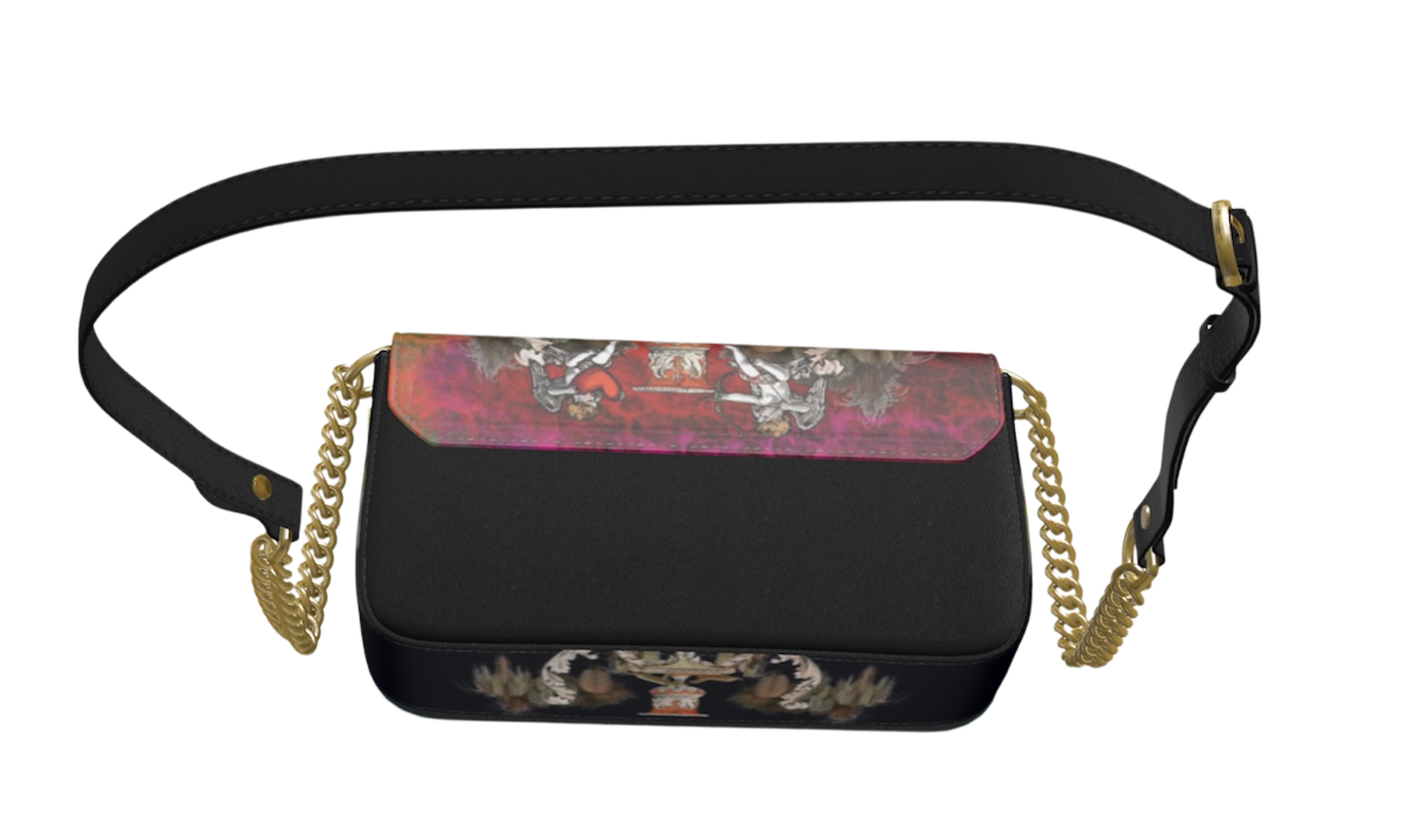 Su diseño versátil permite su uso como clutch o bandolera, gracias a la inclusión de una correa de cuero y una cadena dorada. Los herrajes metálicos, la solapa con cierre magnético oculto y el interior en ante negro contribuyen a su sofisticación y durabilidad.