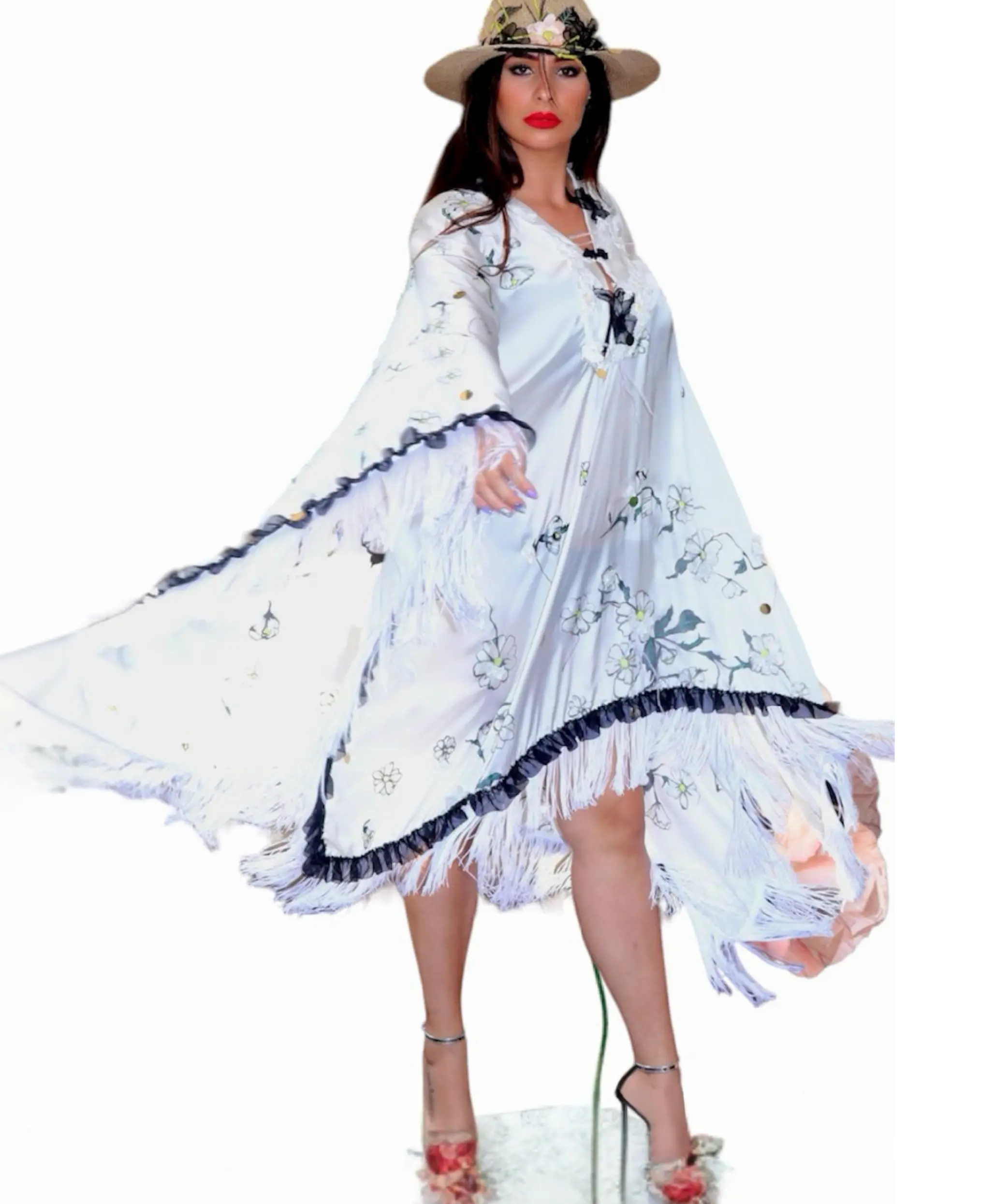 This poncho is the ideal union of a bohemian aesthetic with an artistic and elegant touch. A unique garment to stand out with style!