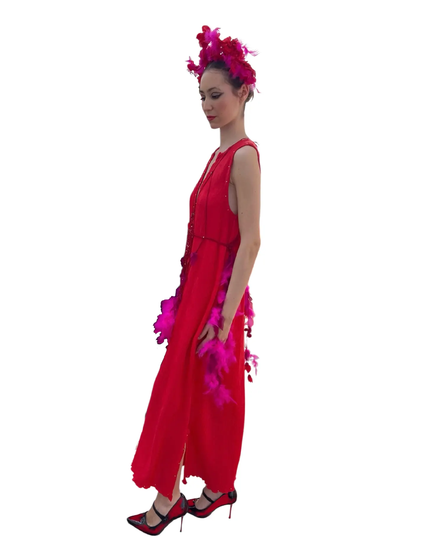 This is a long, straight dress in a vibrant reddish-orange tone, made with a Fortuny-style fabric that gives it a fluid drape and a pleated texture. It features a deep V-neckline and is adorned with a dreamcatcher-style overlay made of fine ribbon, from which fuchsia feathers hang, adding an exotic and dynamic touch to the outfit.