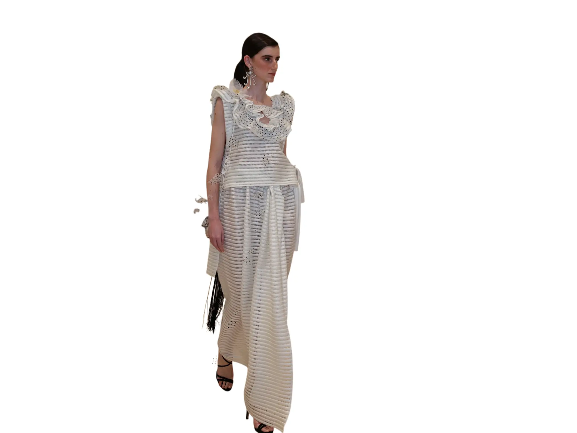 This ethereal and fluid off-white design is composed of two pieces that combine delicacy and character. The long, transparent skirt evokes a feeling of absolute lightness, while the blouse is adorned with intricate lace and ruffle details that provide an air of sophistication, volume, and femininity.