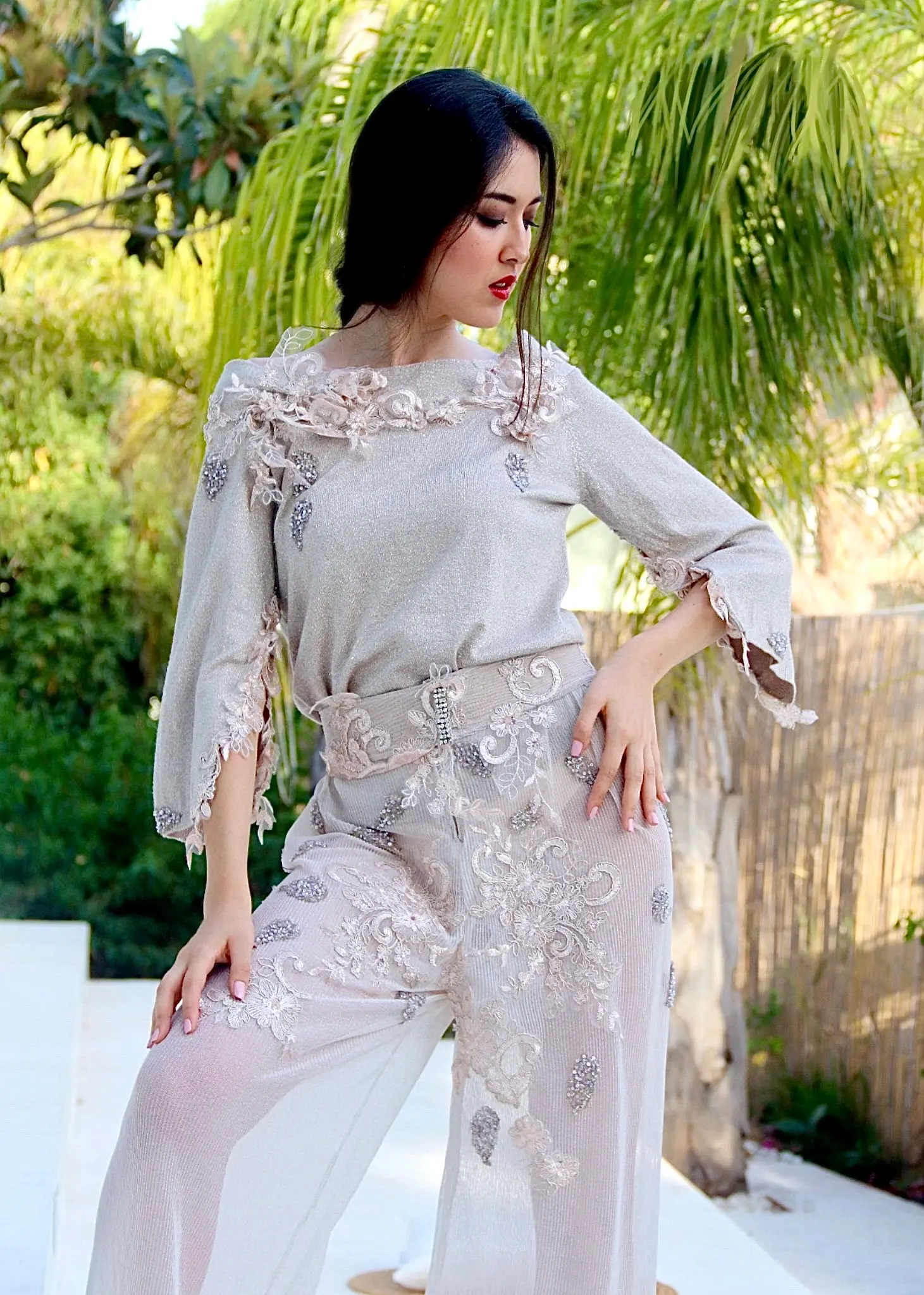 “Subtle Chic” – Sweater and Trousers Set with Lace, Crystals, and Rhinestones