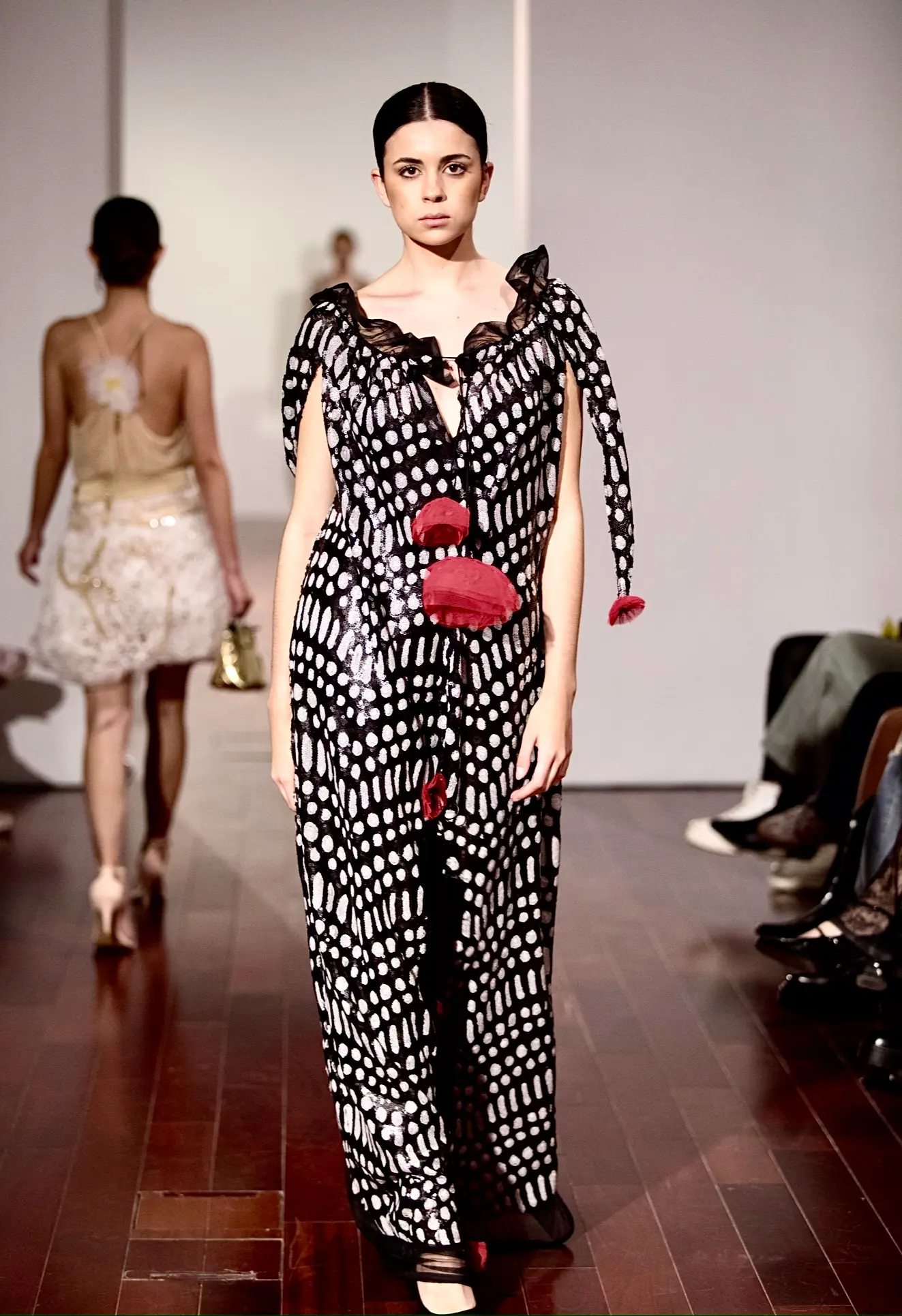 • A black sequin base with an abstract white pattern, inspired by modern art